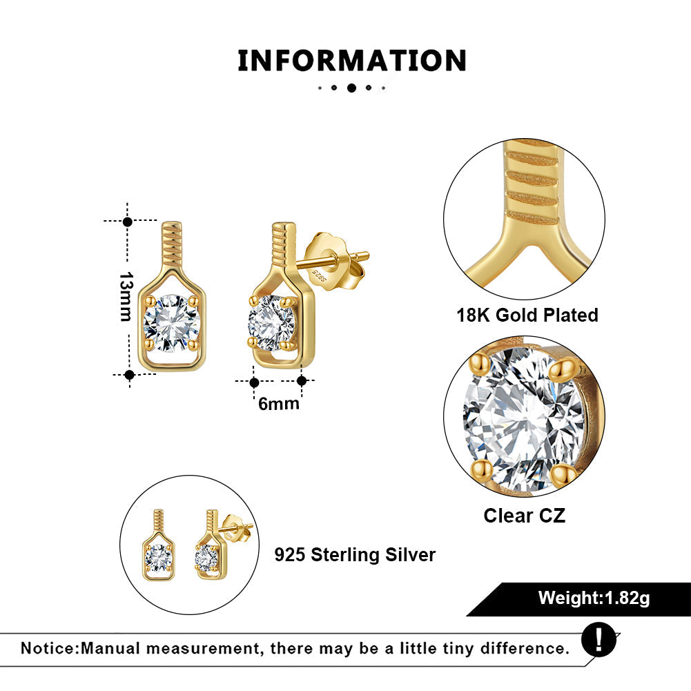 Elevate your style with the Elegant Pickleball Sparkler Paddle Stud Earrings. Crafted from 18K gold-plated sterling silver, these earrings feature a stunning sparkling CZ diamond at their center, making them the perfect accessory for any pickleball enthusiast.